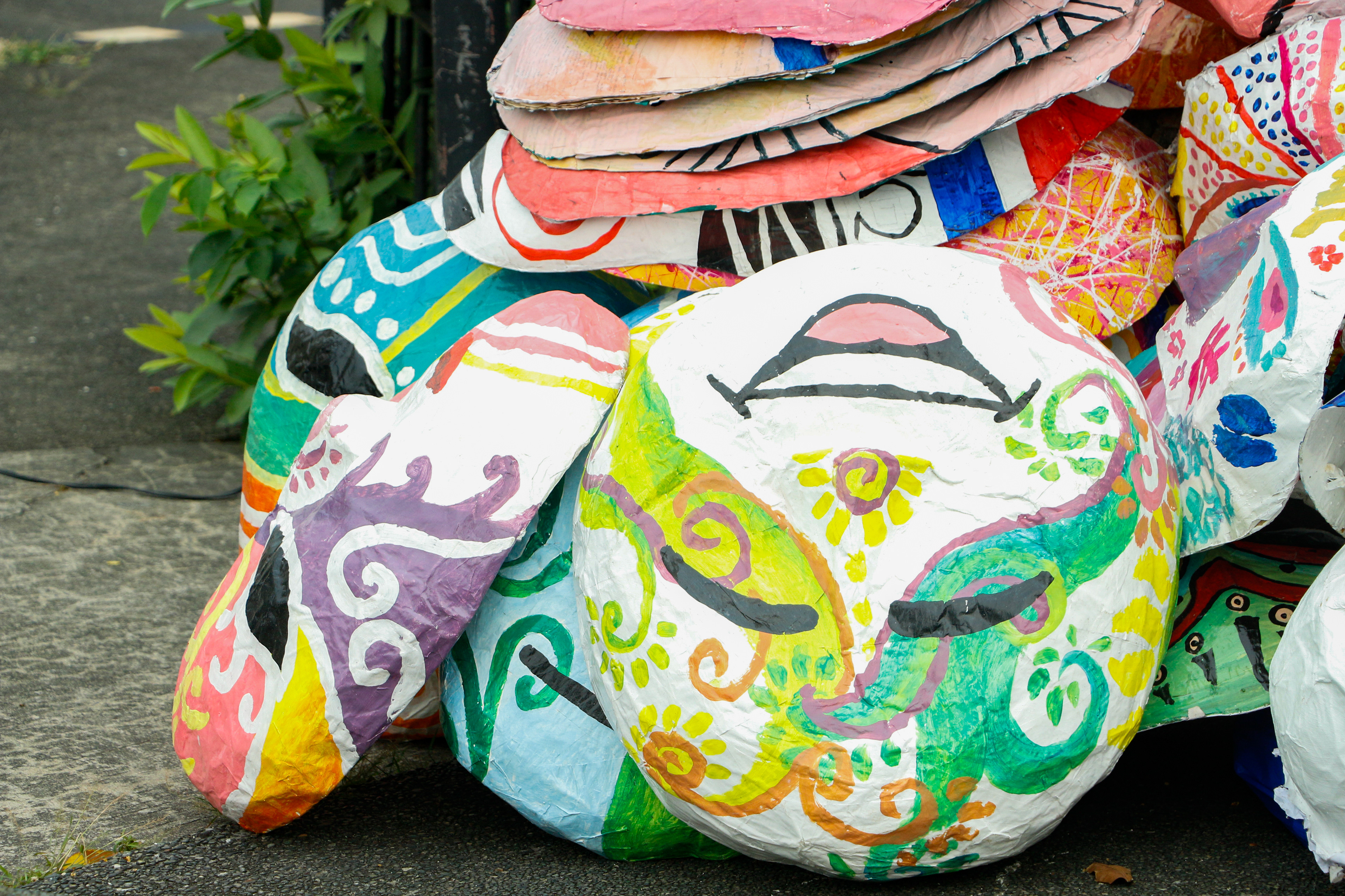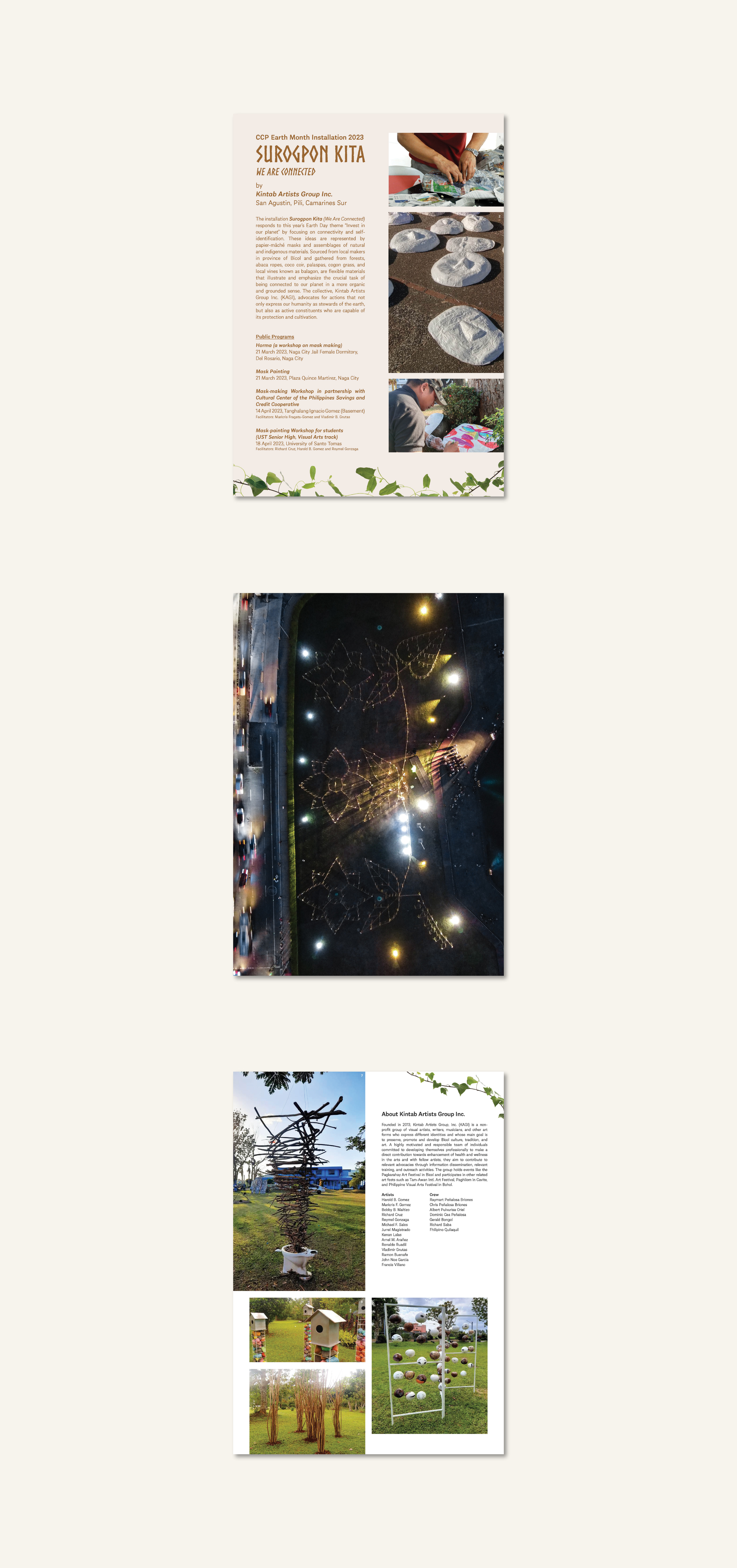 The art installation Surogpon Kita (We Are Connected) responds to the 2023 Earth Day theme “Invest in our planet” by focusing on connectivity and self-identification. These ideas are represented by papier-mâché masks and assemblages of natural and indigenous materials. Sourced from local makers in the province of Bicol and gathered from forests, abaca ropes, coco coir, palaspas, cogon grass, and local vines known as balagon, are flexible materials that illustrate and emphasize the crucial task of being connected to our planet in a more organic and grounded sense. The collective, Kintab Artists Group Inc. (KAGI), advocates for actions that not only express our humanity as stewards of the earth, but also as active constituents who are capable of its protection and cultivation.